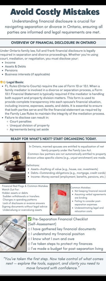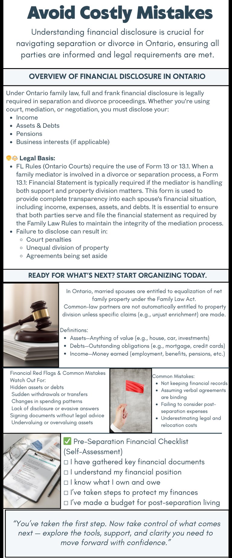 I organize and clarify financial information so both parties are working from a shared, accurate understanding of assets, debts, and support considerations—reducing confusion and unnecessary conflict.